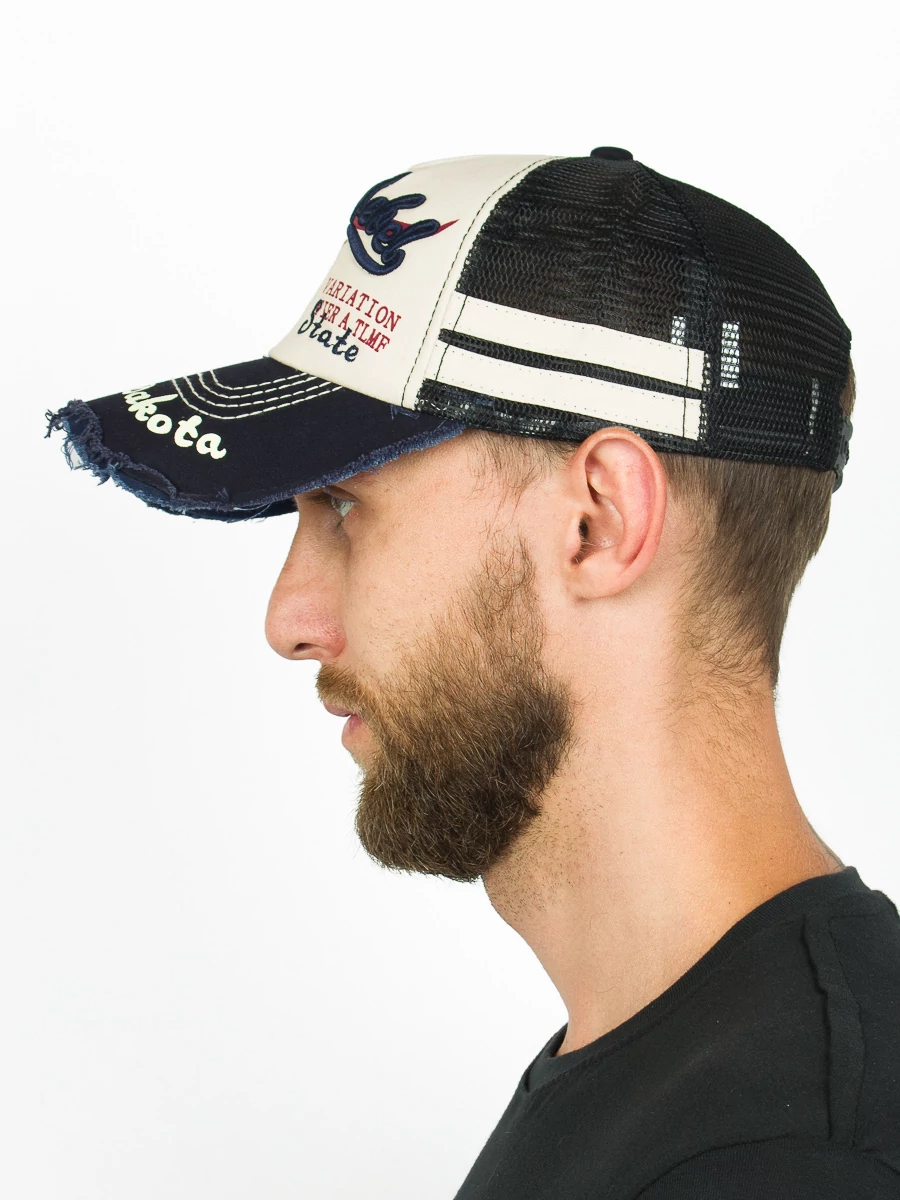 Легкая летняя потертая бейсболка с сеткой шестиклинка с твёрдым жестким козырьком и дополнительными вентиляционными отверстиями. Джинсовая рваная кепка с сеткой с надписью вышитыми буквами с аппликацией. Очень плотная 100% хлопковая ткань, прошита плоским двойным швом. Сзади предусмотрен пластиковый ремешок. Бейсболка регулируется по объему головы от 58 см до 60 см. Потертая джинсовая бейсболка отлично впишется в стиль casual.