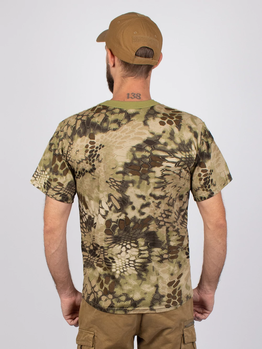 Футболка изготовлена из высококачественного стопроцентного хлопка, что обеспечивает ее воздухопроницаемость, гигроскопичность и легкость при стирке. Изделия из такого материала прочны, легки и приятны на ощупь, поэтому одежда из них хорошо подходит для носки в летний сезон. Такая футболка отлично подойдет как военнослужащим, так и любому мужчине, которому нравятся вещи с камуфляжной расцветкой. 100% хлопок. Вес 100 грамм