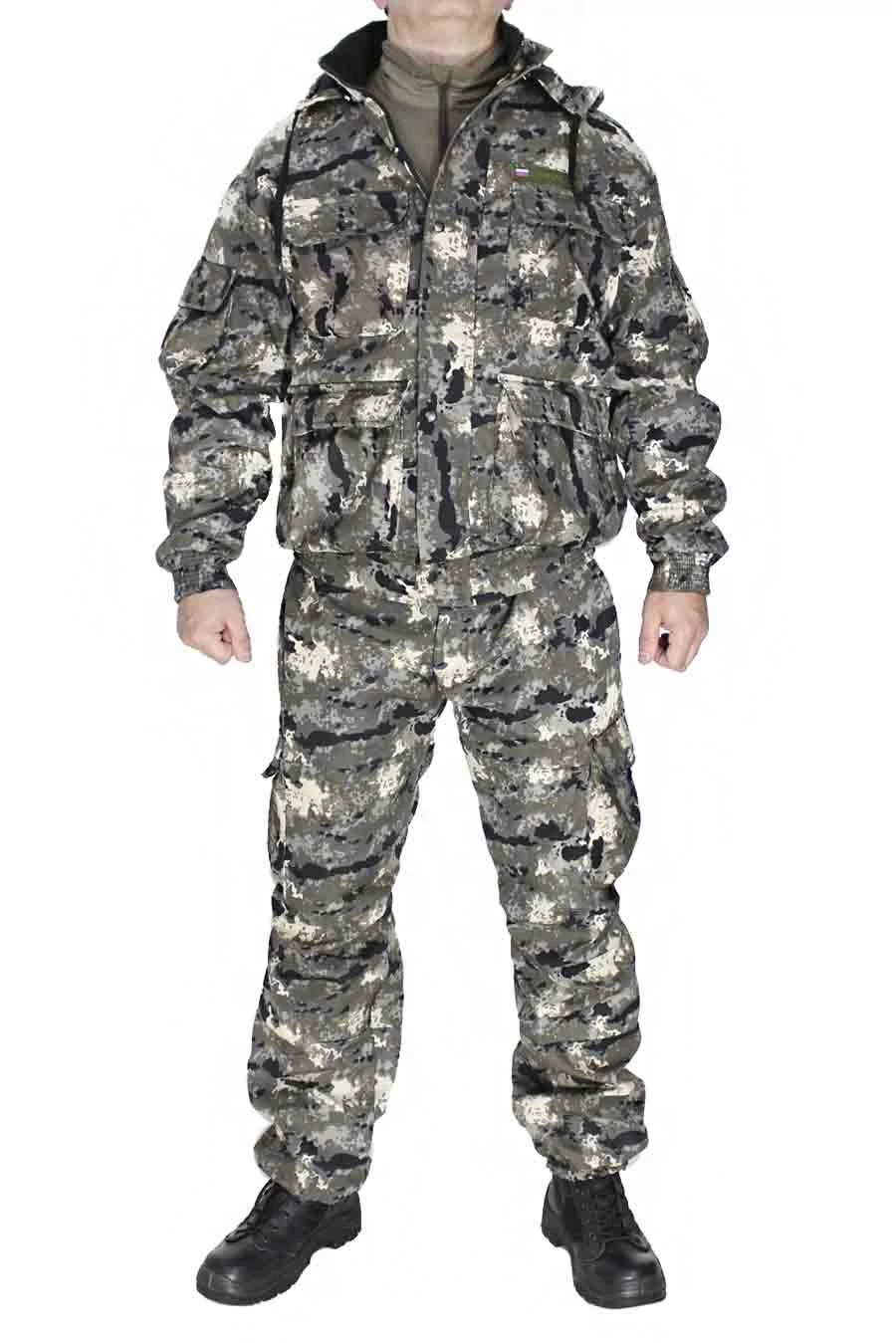 Костюм тактический демисезонный утепленный флисовой подкладкой "Следопыт". Цвет: камуфляж grey vegetato. Состав костюма: куртка и брюки. Всё остальное в комплект не входит. Куртка с центральной застежкой на молнию и ветрозащитной тканевой вставкой на кнопках. Капюшон отстегивается с помощью молнии и регулируется с помощью шнурка. Карманы куртки: 2 накладных нагрудных, 2 накладных поясных кармана, а также 2 накладных карамана на рукавах. Манжеты и низ куртки на резинке. Брюки с центральной застежкой на молнию и пуговицу. В пояс брюк вставлена эластичная тесьма-резинка, что делает их более комфортными во время активного движения. 5 шлевок под ремень. Карманы брюк: стандартные прорезные поясные карманы без застежки по одному с каждой стороны, так же имеются накладные карманы боковые карманы на липучке по одному с каждой стороны. На коленях и по низу брюк сделана дополнительная утягивающая вставка, чтобы брюки не задирались при сгибании ноги.