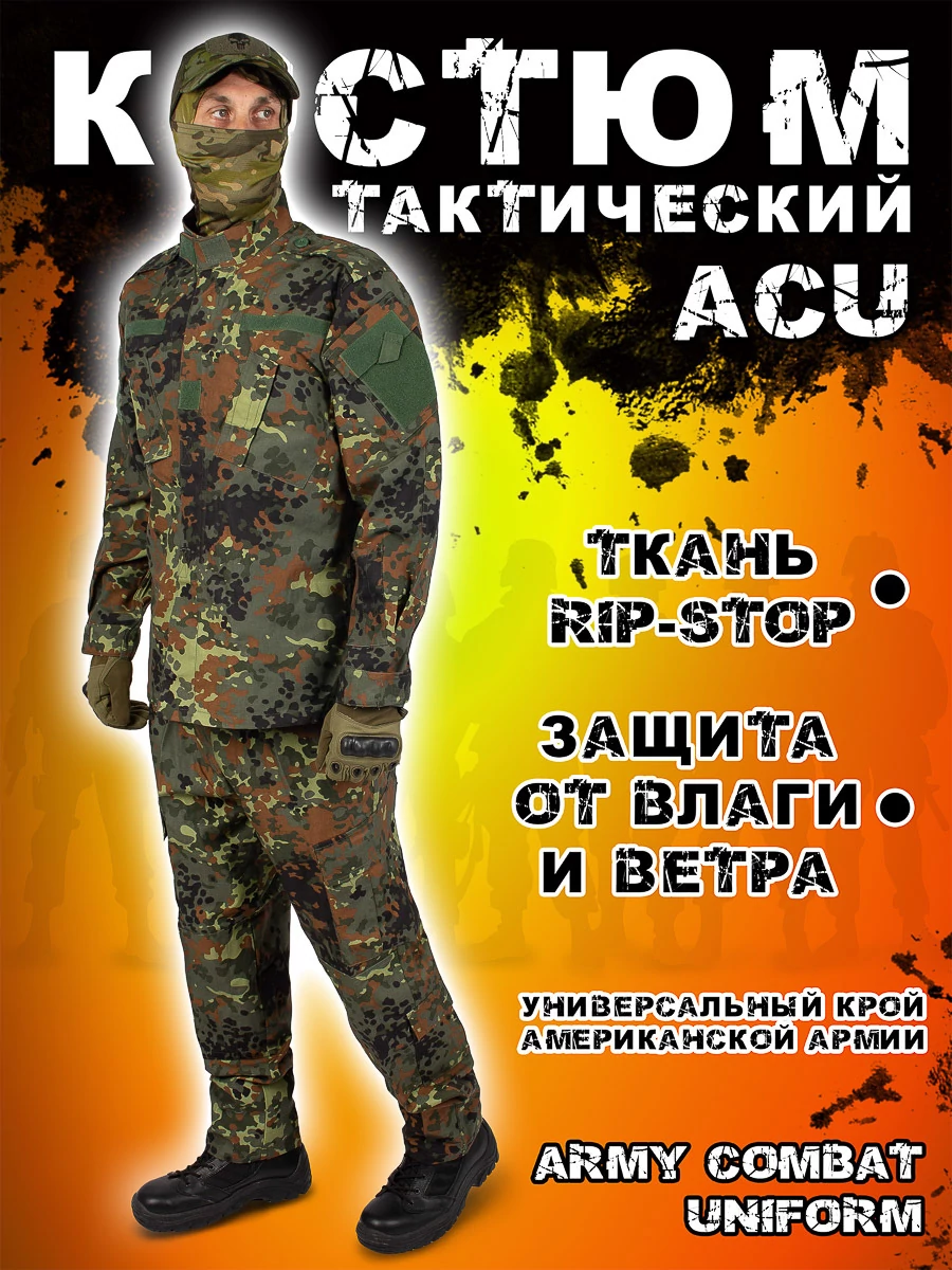 Летний тактический костюм ACU Rip-stop с кителем и брюками. Армейский костюм быстро сохнет, устойчив к царапинам и различным повреждениям. Данная тактическая одежда отлично подходит для страйкбола, пейнтбола и других военных игр, а также для походов, треккинга и альпинизма, охоты, рыбалки и других видов спорта на открытом воздухе. Материал: 35% хлопок и 65% полиэстер. Описание: Китель военный (куртка) изготовлен с применением технологии Rip-stop. Куртка застегивается на молнию, которая сверху закрыта слоем ткани на застежке-липучке для дополнительной защиты. Воротник так же можно затянуть на застежку-липучку. На плечах расположено крепление для погон. Рукав втачной, классический. Ткань на локтях усилена для предотвращения быстрого истирания, а на манжетах расположены еще застежки-липучки для регулирования рукава по длине запястья. Карманы кителя: 2 косых кармана на груди, 2 накладных кармана на плечах. Места для патчей предусмотрены на плечах и груди с обеих сторон. Патчи в комплект не входят. Тактические брюки ACU Rip-stop изготовлены из смесовой ткани, они усилены в области сидения и коленей. Брюки застегиваются на пуговицу, есть шлейки для ремня. Карманы брюк: 2 кармана по бокам; 2 кармана сзади; 2 накладных кармана на бедрах, 2 специальных кармана в нижней части брюк.