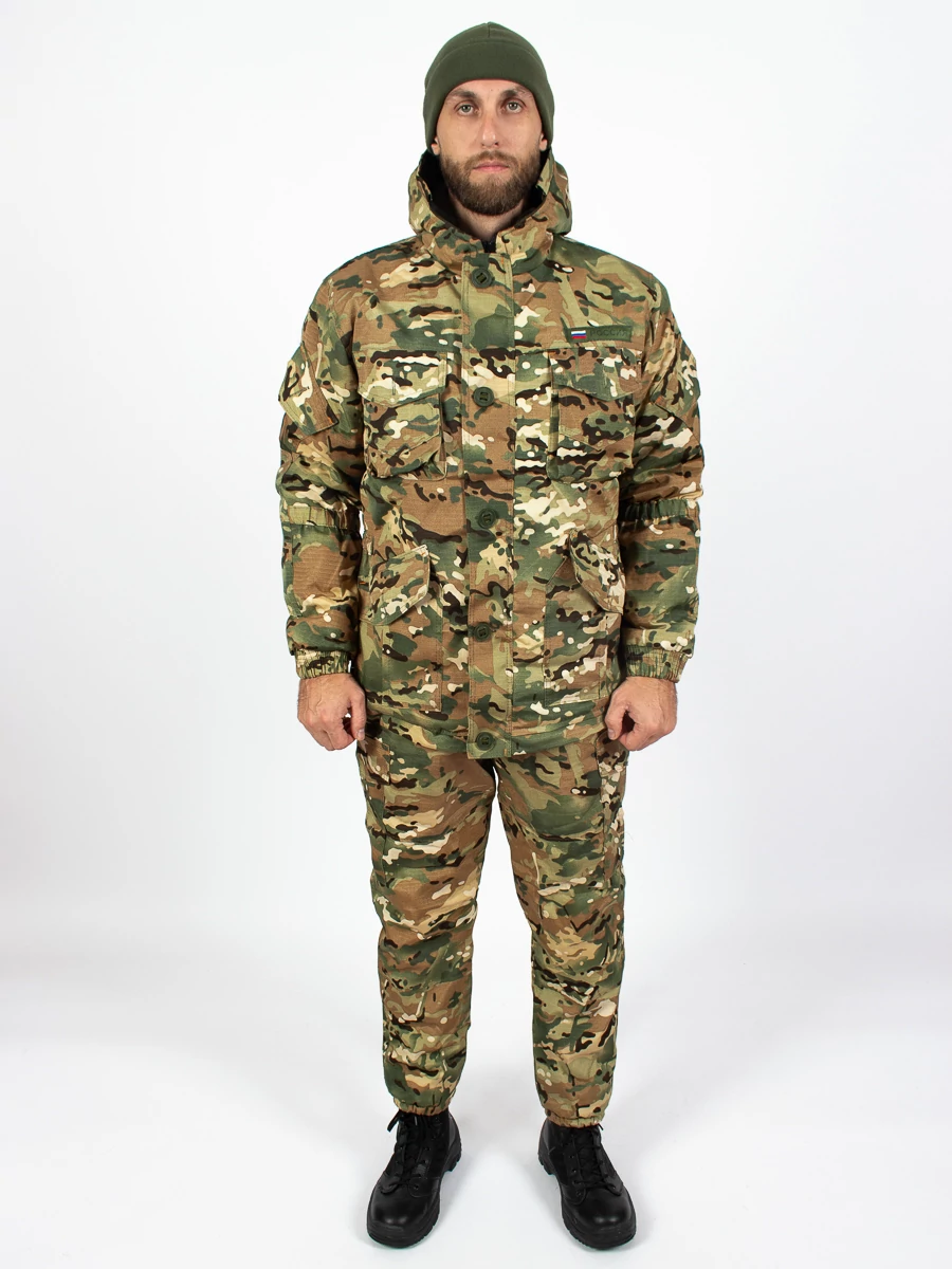Костюм зимний мужской Горка Ангара - 30С камуфляж MTP. Шуршит. Состав костюма: куртка - 1 шт. и брюки на подтяжках - 1 шт. Ткань: рип-стоп (полиэстер 65%, хлопок 35%). Утеплитель: Холлофайбер. Подкладка: Флис (100% полиэстер). Манжеты - резинка. Особенности куртки: Одинарная молния закрыта ветрозащитной планкой из ткани. Для дополнительной защиты от ветра планка застегивается пуговицы через которые пропущена лента. Капюшон регулируется с помощью шнурка. Карманы куртки: 1 внутренний карман; 2 верхних нагрудных накладных кармана на пуговицах, и 2 нижних, спрятанных под верхними, нагрудных накладных кармана на молнии; 2 поясных накладных кармана на пуговице, 2 нарукавных кармана. На рукавах поверх карманов пришиты крепления-липучки "Велкро" 10х10 см. Особенности брюк: Фасон: брюки с подтяжками. Центральная застежка брюк: пуговицы и молния. Подтяжки крепятся с помощью тканевых ремешков, пришитых к поясу брюк. В области талии сделана эластичная вставка резинка, растягивающаяся по вашему объему. Карманы: 2 боковых прорезных кармана без застежки, 2 набедренных накладных на пуговице. Костюмы рассчитаны на рост 176-182 см. Низ брюк на резинке.