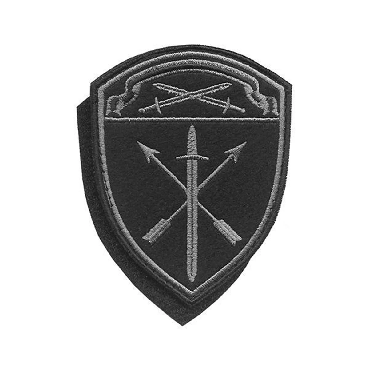 Нарукавный знак выполнен в виде треугольного с закругленными сторонами щита чёрного цвета с окантовкой и разделительной полосой серого цвета, делящей поле щита на верхнюю (головную) и нижнюю (основную) части. В головной части щита помещена лента ордена Красной Звезды и под ней два скрещенных по диагонали серебристых меча клинками вверх. В основной части щита помещены: серебристый меч, поставленный вертикально, рукоятью вверх, и за ним две серые стрелы, скрещенные по диагонали и направленные вверх. Нитки: полиэстер или металлизированная нить. Основа: габардин, фетр, дополнение жесткой подложкой из специального картона. Такая конструкция шеврона обеспечивает высокую жесткость, отсутствие катышков, стойкость к истиранию, водостойкость.