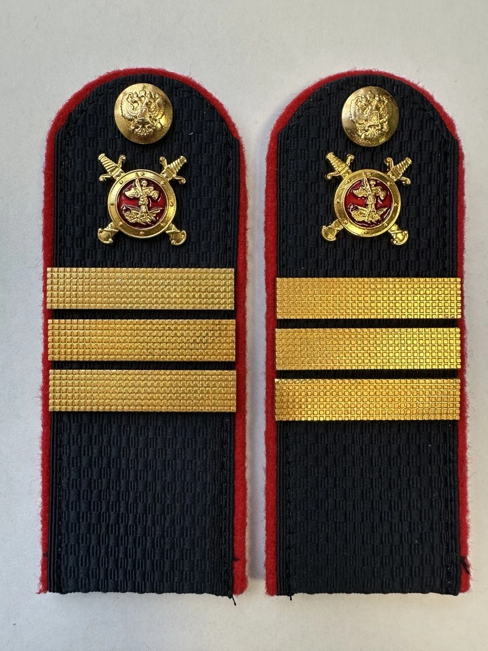 Погоны МВД темно-синие ткань жакард цвета, основа картон. Погоны идут сразу в сборе с металлической фурнитурой из латуни и застежкой кляммером. При креплении жестких погон необходимо использовать застежку-кляймер. Необходимо продеть ленту погона в специальные петли на уставной форме.