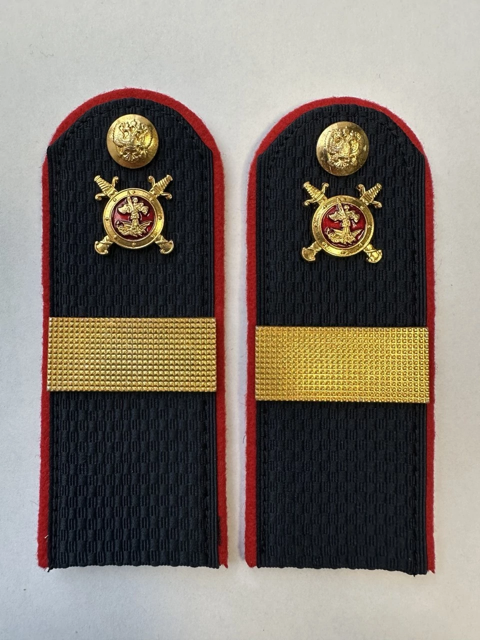 Погоны МВД темно-синие ткань жакард цвета, основа картон. Погоны идут сразу в сборе с металлической фурнитурой из латуни и застежкой кляммером. При креплении жестких погон необходимо использовать застежку-кляймер. Необходимо продеть ленту погона в специальные петли на уставной форме.