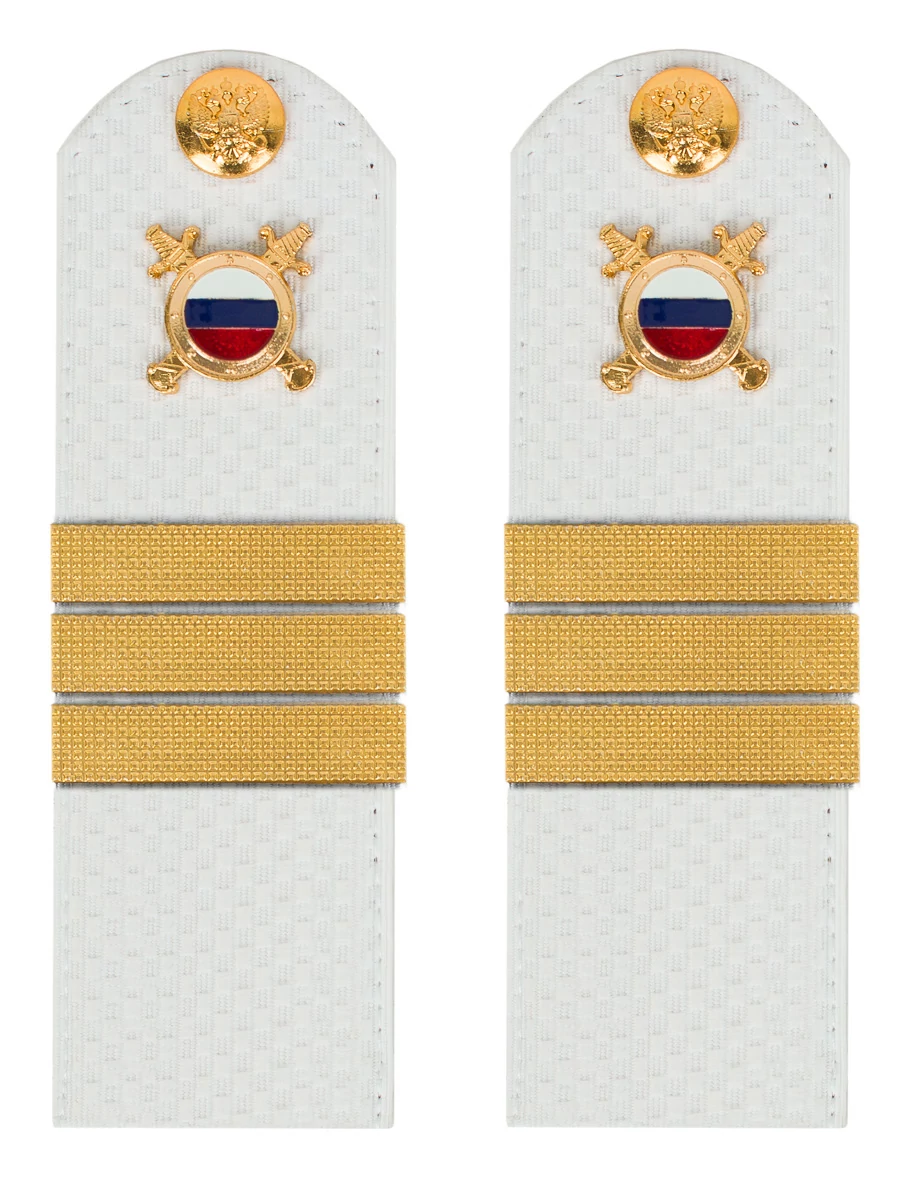 Размер 15 см на 5,5 см. Толщина 1 мм. Погоны МВД белые ткань жаккард белого цвета, основа картон. Погоны идут сразу в сборе с металлической фурнитурой из латуни и застежкой кляммером. При креплении жестких погон необходимо использовать застежку-кляймер. Необходимо продеть ленту погона в специальные петли на уставной форме.