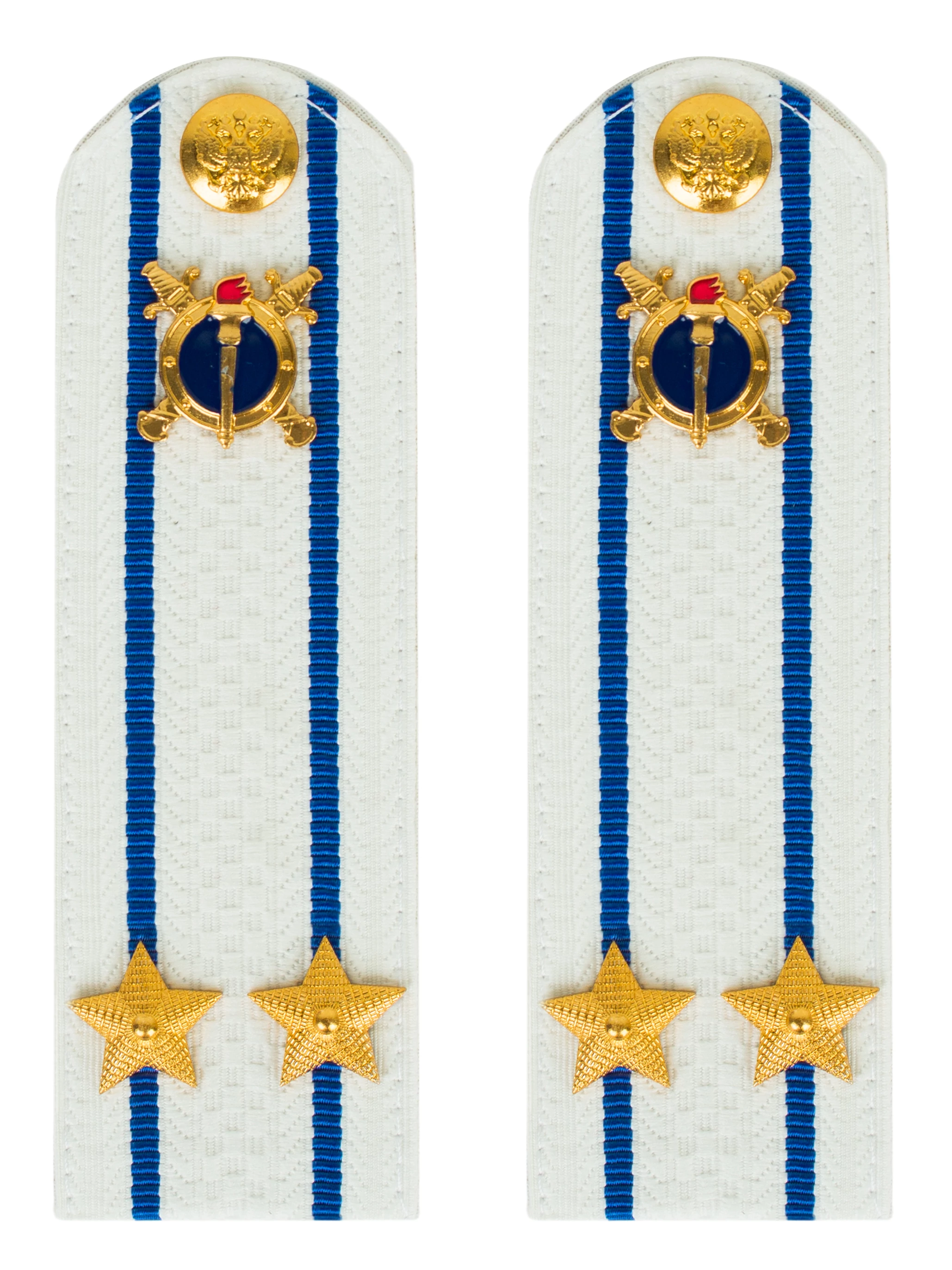 Погоны Юстиции ткань жаккард белого цвета с двумя просветами на картонной основе. Погоны идут сразу в сборе с металлической фурнитурой из латуни и застежкой кляммером. При креплении жестких погон необходимо использовать застежку-кляймер. Необходимо продеть ленту погона в специальные петли на уставной форме.