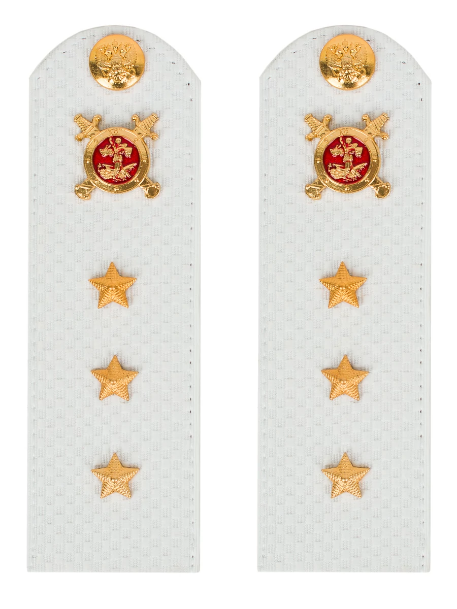 Погоны МВД белые ткань жаккард белого цвета, основа картон. Погоны идут сразу в сборе с металлической фурнитурой из латуни и застежкой кляммером. При креплении жестких погон необходимо использовать застежку-кляймер. Необходимо продеть ленту погона в специальные петли на уставной форме.