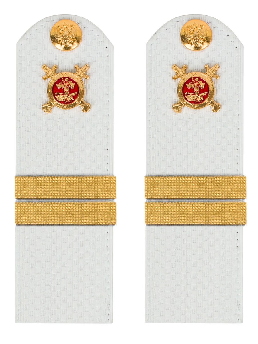 Погоны МВД белые ткань жаккард белого цвета, основа картон. Погоны идут сразу в сборе с металлической фурнитурой из латуни и застежкой кляммером. При креплении жестких погон необходимо использовать застежку-кляймер. Необходимо продеть ленту погона в специальные петли на уставной форме.