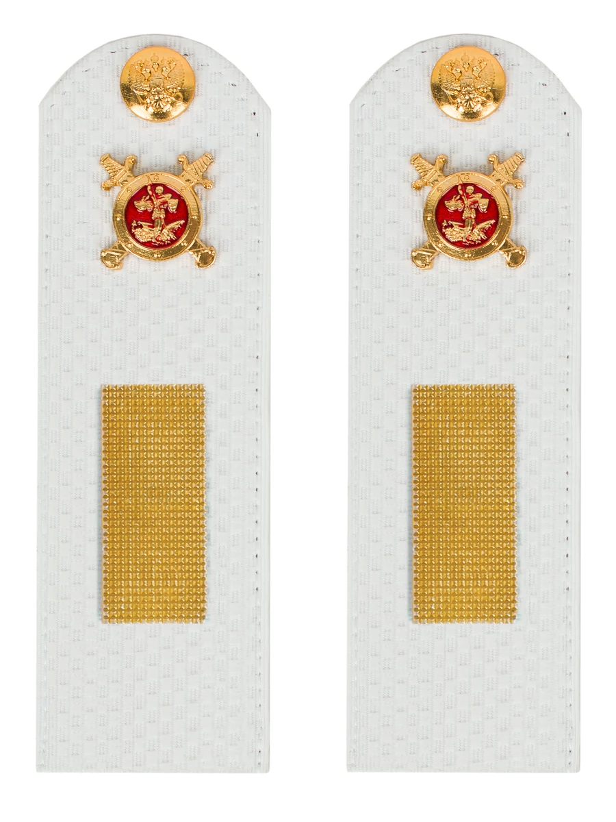 Погоны МВД белые ткань жаккард белого цвета, основа картон. Погоны идут сразу в сборе с металлической фурнитурой из латуни и застежкой кляммером. При креплении жестких погон необходимо использовать застежку-кляймер. Необходимо продеть ленту погона в специальные петли на уставной форме.