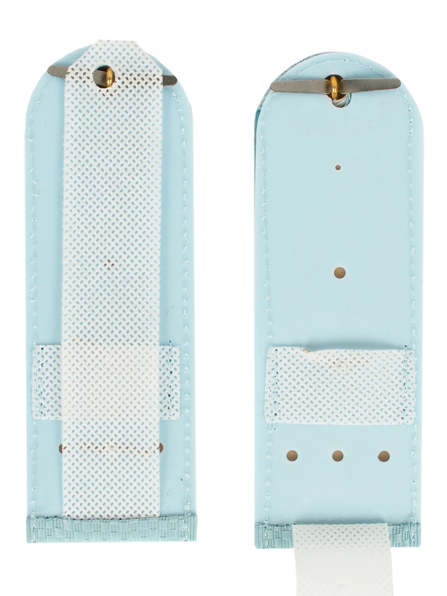 Погоны МВД ткань жаккард голубого цвета, основа картон. Погоны идут сразу в сборе с металлической фурнитурой из латуни и застежкой кляммером. При креплении жестких погон необходимо использовать застежку-кляймер. Необходимо продеть ленту погона в специальные петли на уставной форме.