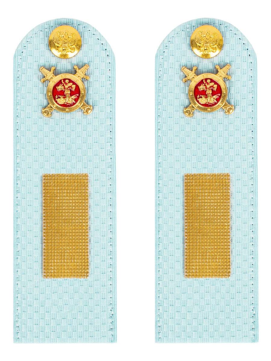 Погоны МВД ткань жаккард голубого цвета, основа картон. Погоны идут сразу в сборе с металлической фурнитурой из латуни и застежкой кляммером. При креплении жестких погон необходимо использовать застежку-кляймер. Необходимо продеть ленту погона в специальные петли на уставной форме.
