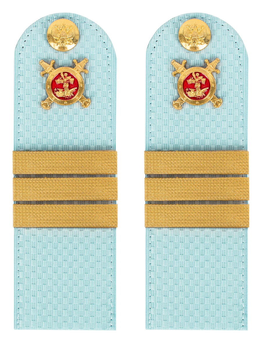Погоны МВД ткань жаккард голубого цвета, основа картон. Погоны идут сразу в сборе с металлической фурнитурой из латуни и застежкой кляммером. При креплении жестких погон необходимо использовать застежку-кляймер. Необходимо продеть ленту погона в специальные петли на уставной форме.