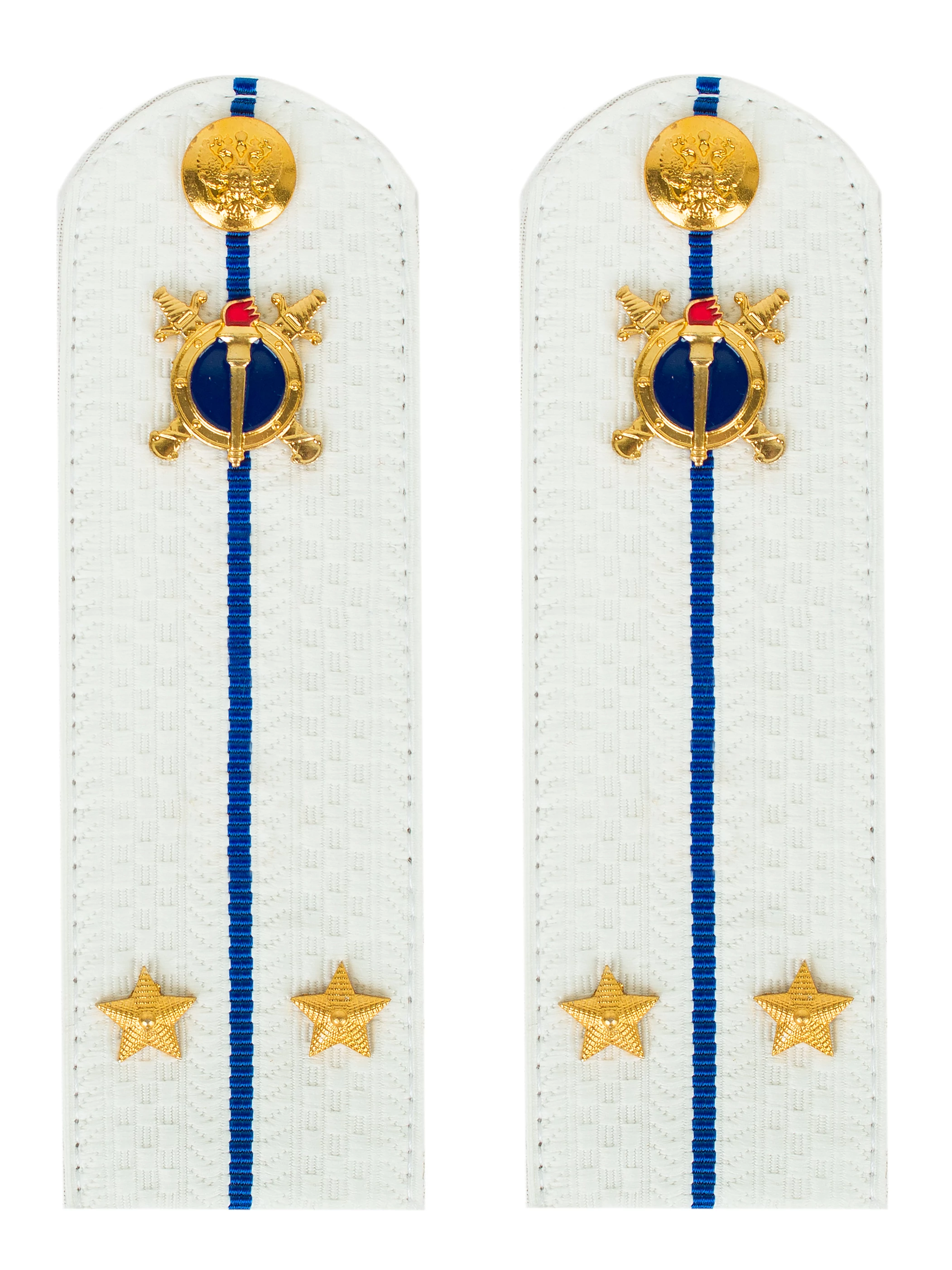 Размер 12 см. Погоны Юстиции ткань жаккард белого цвета с синим просветом на картонной основе. Погоны идут сразу в сборе с металлической фурнитурой из латуни и застежкой кляммером. При креплении жестких погон необходимо использовать застежку-кляймер. Необходимо продеть ленту погона в специальные петли на уставной форме.