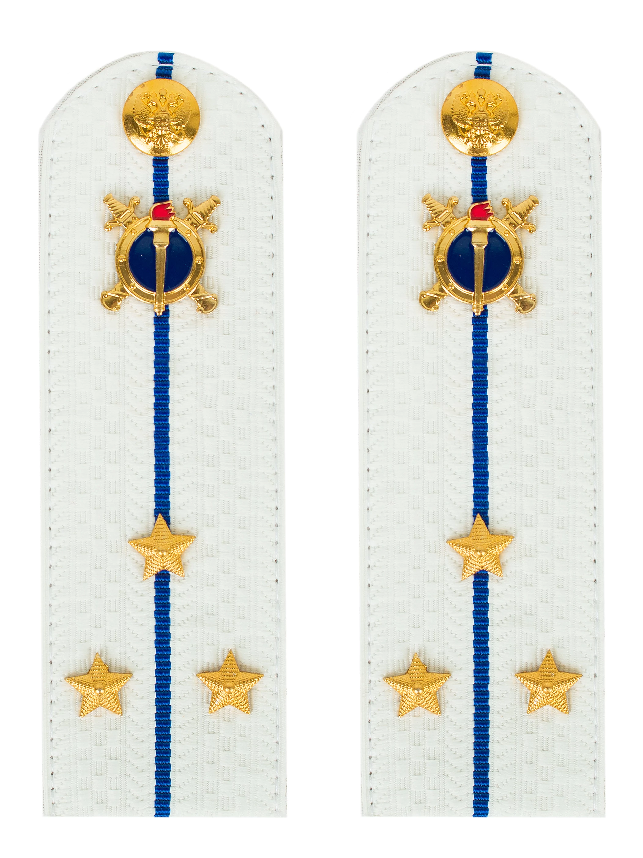 Размер 12 см. Погоны Юстиции ткань жаккард белого цвета с синим просветом на пластиковой основе. Погоны идут сразу в сборе с металлической фурнитурой из латуни и застежкой кляммером. При креплении жестких погон необходимо использовать застежку-кляймер. Необходимо продеть ленту погона в специальные петли на уставной форме.