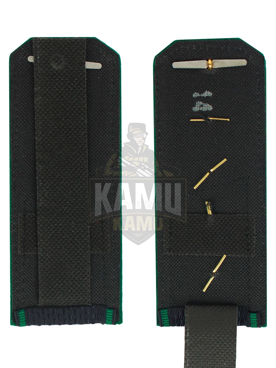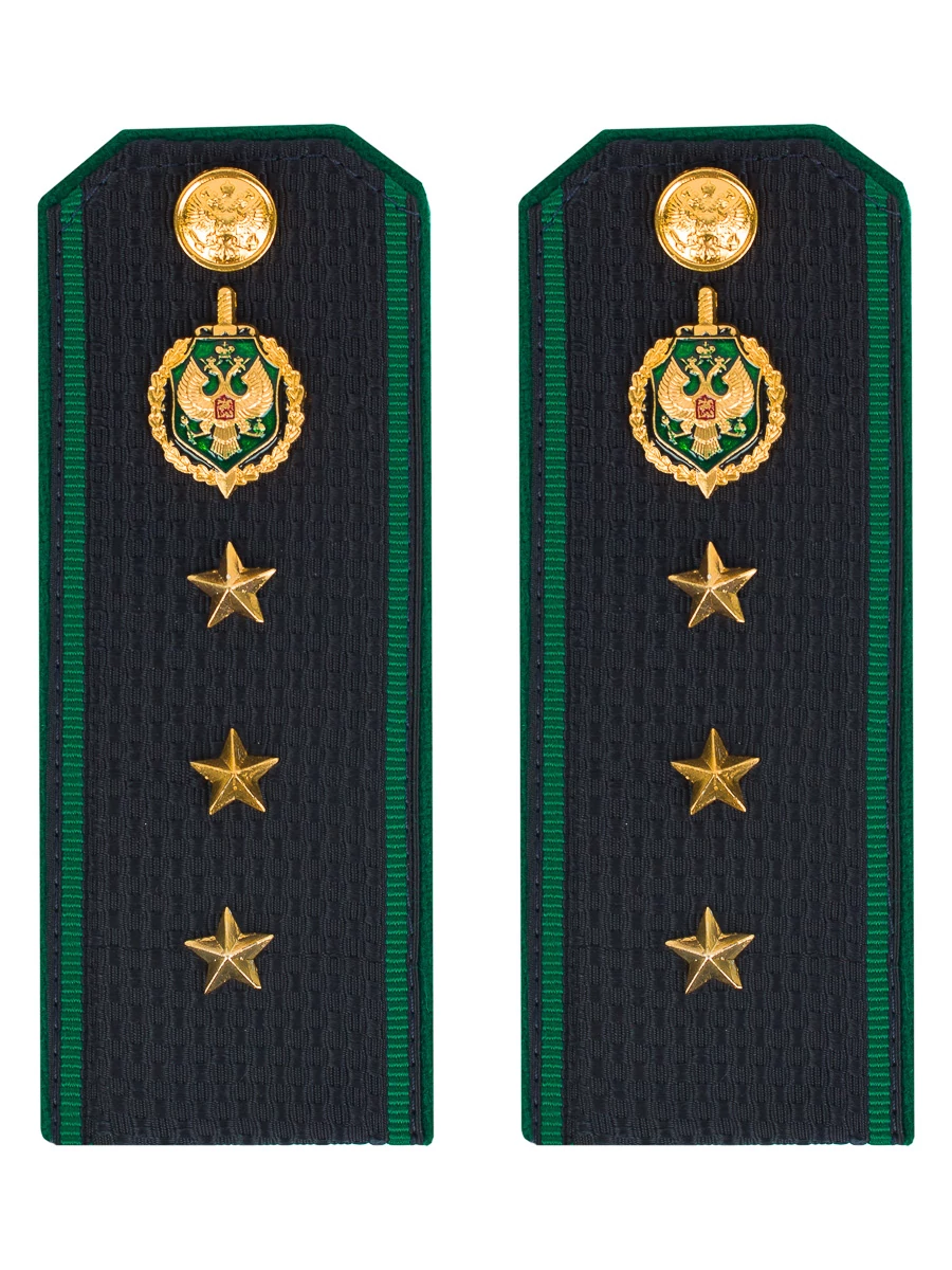 Размер 12 см. Погоны ПС ФСБ ткань жаккард темно-синего цвета с зеленым просветом на картонной основе. Погоны идут сразу в сборе с металлической фурнитурой из латуни и застежкой кляммером. При креплении жестких погон необходимо использовать застежку-кляймер. Необходимо продеть ленту погона в специальные петли на уставной форме.