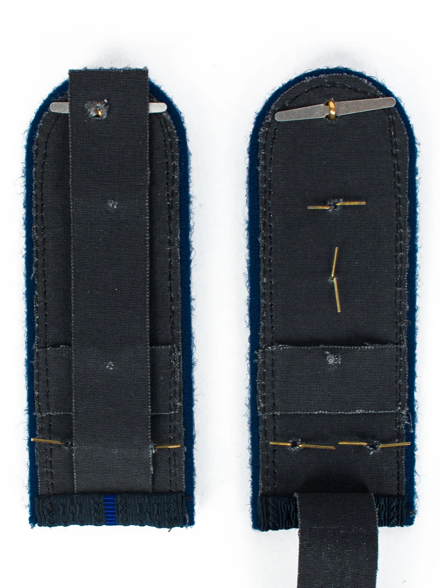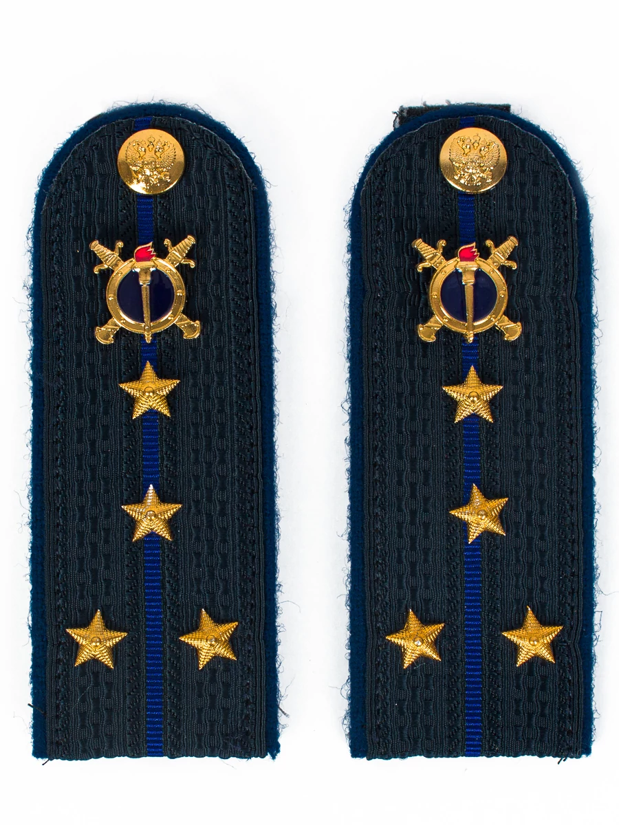 Погоны Юстиции Капитан синие В СБОРЕ 1 пара. Основа: КАРТОН. Размер: 13см. Ткань: 100% полиэстер. Фурнитура: металл латунь. Форма: Полукруг. Погоны идут сразу в сборе с металлической фурнитурой из латуни и застежкой кляммером. Петличная эмблема сотрудников органов внутренних дел Российской Федерации, имеющих специальные звания юстиции, представляет собой золотистое (желтое) изображение круглого щита, расположенного поверх двух перекрещенных мечей в ножнах рукоятями вверх. В синем поле щита - золотистое (желтое) изображение факела с красным отблеском пламени. На оборотной стороне эмблема имеет приспособление для крепления на форме одежды. Размер эмблемы 22 x 22 мм.
