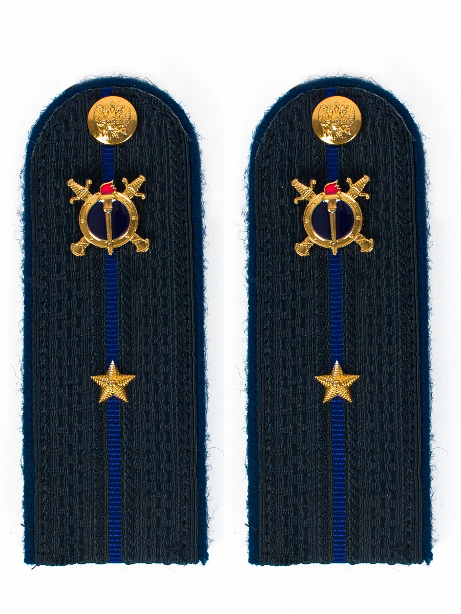 Погоны Юстиции Младший лейтенант синие В СБОРЕ 1 пара. Основа: КАРТОН. Размер: 13см. Ткань: 100% полиэстер. Фурнитура: металл латунь. Форма: Полукруг. Погоны идут сразу в сборе с металлической фурнитурой из латуни и застежкой кляммером. Петличная эмблема сотрудников органов внутренних дел Российской Федерации, имеющих специальные звания юстиции, представляет собой золотистое (желтое) изображение круглого щита, расположенного поверх двух перекрещенных мечей в ножнах рукоятями вверх. В синем поле щита - золотистое (желтое) изображение факела с красным отблеском пламени. На оборотной стороне эмблема имеет приспособление для крепления на форме одежды. Размер эмблемы 22 x 22 мм.