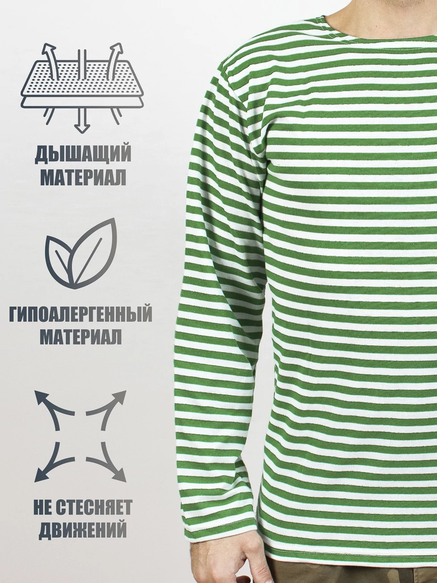 Тельняшка пограничника (зеленая полоса) из 100% хлопка. Описание зеленой тельняшки: Тельняшка пограничника сделана их 100% хлопка, она изготовлена в соответствии с ГОСТом МО РФ. Двухниточная вязка тельняшки с зелеными полосами обеспечивает одинаковый цвет и рисунок с внешней и внутренней стороны. Тельняшка в зеленую полоску изготовлена в отличном качестве и станет желанным подарком для пограничника.